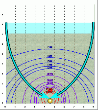 La figure 167 représente une coupe transversale du gâteau de drêches étant rincé par un tuyau courant au milieu. Les lignes entourant le collecteur déterminent le potentiel de débit égal, c'est à dire la pression. Regardez la ligne de gradient avec une valeur relative de 100 dans les figures 168-173 pour mieux visualiser les différences entre les différentes configurations. Les flèches dans la figure 167 montrent comment le flux est guidé vers le drain par ces gradients de pression. Observez comment le flux est concentré en direction du centre de la cuve, en laissant les zones au niveau des coins avec des vitesses d'écoulement très basses. Des expériences avec des colorants ont montré ce même résultat. Au cours de la filtration, les systèmes à drain simple n'ont pas suffisamment rincé le grain dans les coins tandis que le centre était tellement rincé que l'extraction des tanins était plus probable.