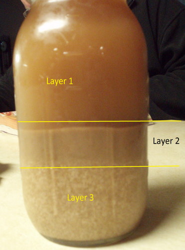 Lorsque votre solution ressemble à la photo, versez délicatement la levure (layer 1) en suspension dans un autre pot stérile et laissez la couche de trouble derrière. La couche mince entre les deux (entre layer 1 et 2 ) contient aussi de la levure, mais il n’y a pas besoin de la recueillir, il y en a beaucoup dans la suspension à condition que la solution n'ait pas été trop longtemps dans le réfrigérateur pour permettre à la partie supérieure de s’éclaircir.